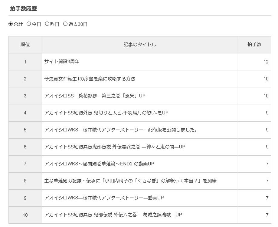 趣味でやっているだけの自己満足の作品やコンテンツにも関わらず、他の方に1拍手でも評価していただけるのは嬉しいです。サイトを続けている限りは例え一人からでも評価していtだけるように頑張ろうと思いますので、引き続き気長にお付き合い頂ければと思います。